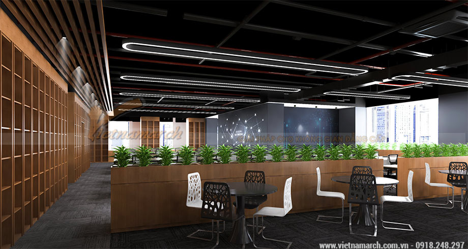 Khu vực ngoài trời được thiết kế tạo thành khu vực nghỉ ngơi, thư giãn và nhâm nhi cafe ngoài trời, cùng ngắm khung cảnh thành phố Hà Nội náo nhiệt. Ngoài ra, văn phòng Viettel còn canteen rất khang trang, rộng rãi.