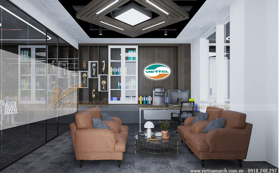 Phòng giám đốc được thiết kế theo phong cách hiện đại. Ghế sofa da ngồi sang trọng và êm ái, trần thạch cao trắng được sử dụng với đèn led hình thoi đặc biệt. Logo Viettel cũng được sử dụng tại không gian phòng giám đốc này.