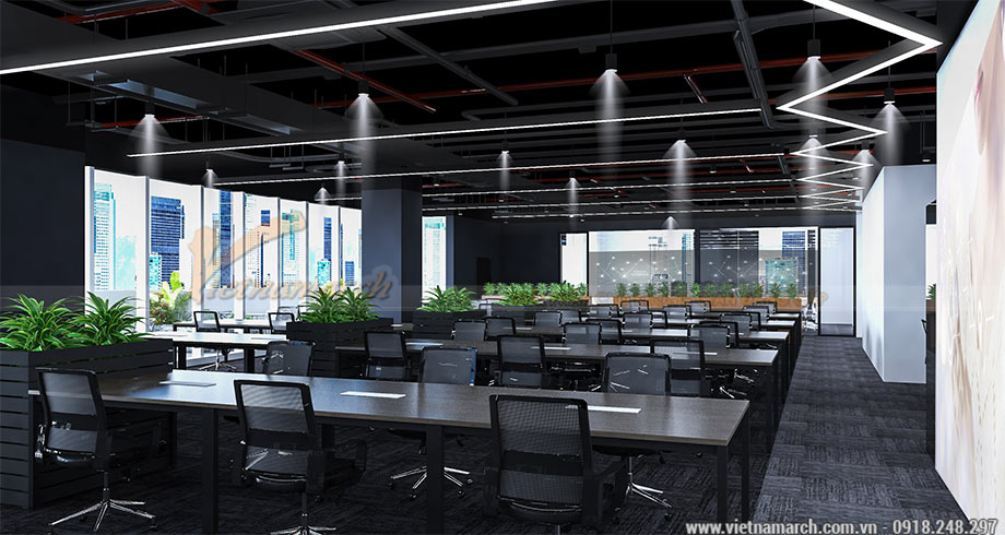 Ánh sáng của không gian văn phòng cũng là sự kết hợp hài hóa giữa ánh sáng tự nhiên và ánh sáng nhân tạo. Từ đó, giúp đảm bảo chiếu sáng trong không gian làm việc. Mặt khác, từng dài đèn led tại khu vực đầu mỗi bàn làm việc tạo hình zic zac. Nó đại diện cho những đường kết nối, là dấu mốc của từng trạm Viettel tại các khu vực tỉnh thành trên cả nước.